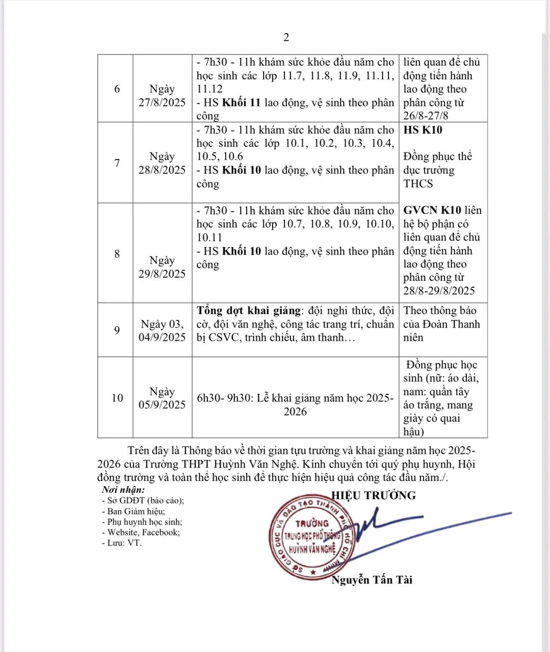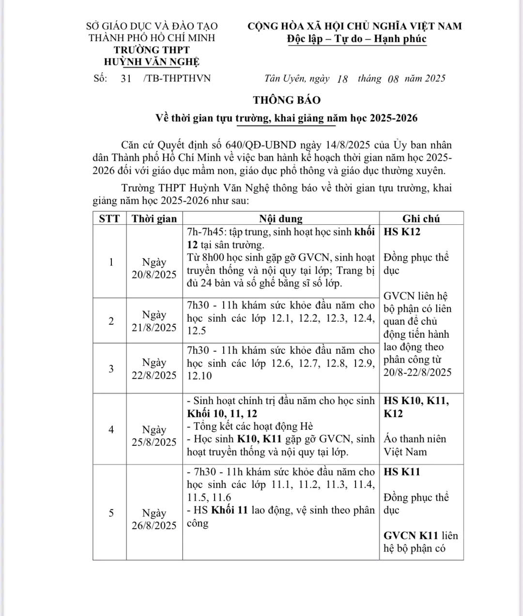 THÔNG BÁO THỜI GIAN TỰU TRƯỜNG, KHAI GIẢNG NĂM HỌC 2025 – 2026