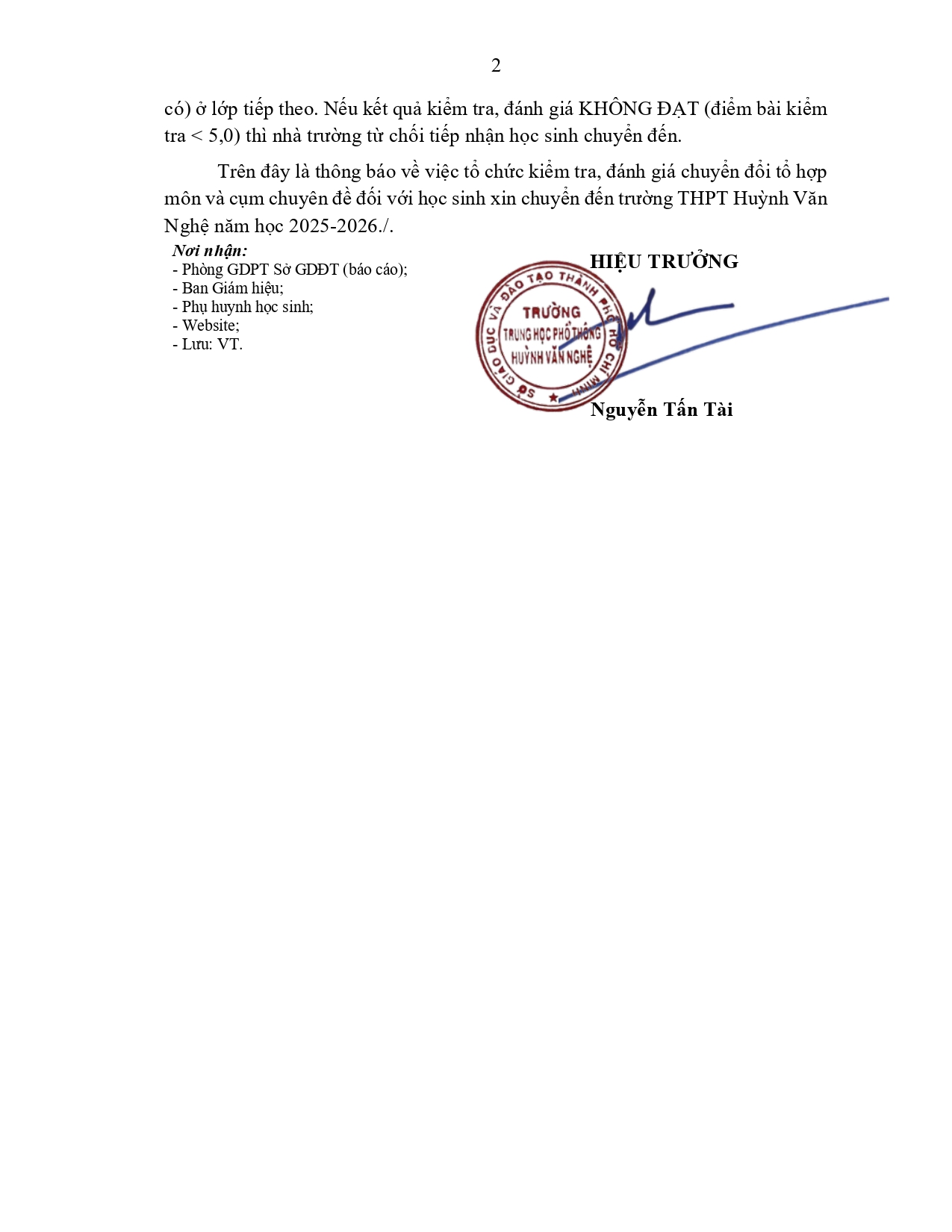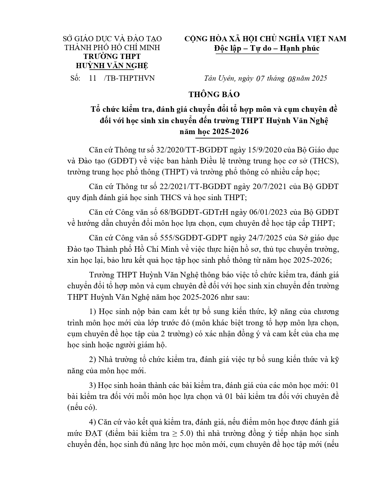 THÔNG BÁO HỌC SINH, THÔNG BÁO-VĂN BẢN, TIN MỚI THÔNG BÁO: Tổ chức kiểm tra, đánh giá chuyển đổi tổ hợp môn và cụm chuyên đề đối với học sinh xin chuyển đến trường THPT Huỳnh Văn Nghệ năm học 2025-2026 9 Tháng 8, 2025 - Nguyễn Thị Quỳnh Trúc - 244 lượt xem Các em học sinh mới chuyển đến trường cần đọc kỹ thông báo bên dưới nhé!!! Bài viết liên quan:THÔNG BÁO LỊCH KIỂM TRA GIỮA KỲ 1 VÀ KIỂM TRA CUỐI…TRƯỜNG THPT HUỲNH VĂN NGHỆ THAM GIA "LIÊN HOAN TIẾNG…CÔNG ĐOÀN TRƯỜNG THPT HUỲNH VĂN NGHỆ THAM GIA HỘI…Thông báo v/v làm thủ tục nhập học đối với học sinh…Thông báo Tuyển sinh vào lớp 10 trường THPT Huỳnh…BẢN KHAI THÀNH TÍCH ĐỀ NGHỊ XÉT TẶNG DANH…